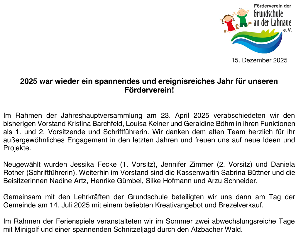Weitere Informationen zum Förderverein der Grundschule an der Lahnaue e.V. sind erhältlich unter :