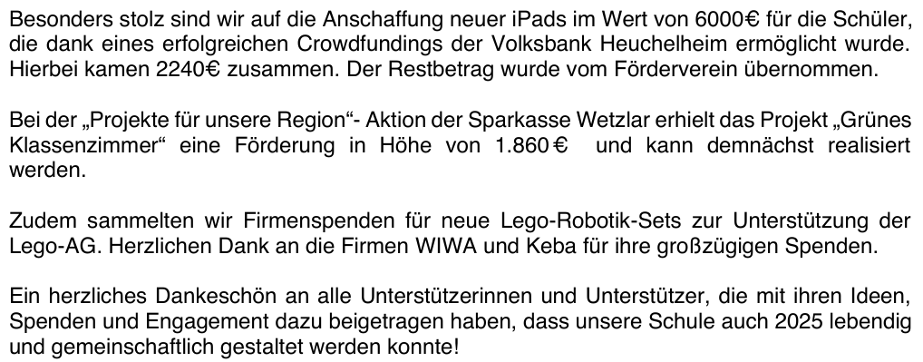 Der Förderverein der Grundschule an der Lahnaue e.V. bedankt sich im Namen aller Mitglieder bei der Grundschule an der Lahnaue für die Organisation und Umsetzung dieser großartigen Projektwoche. Darüber hinaus danken wir der Volksbank Heuchelheim eG sowie allen Sponsoren, Helferinnen und Helfern, die zum Gelingen dieser großartigen Projektwoche beigetragen haben.